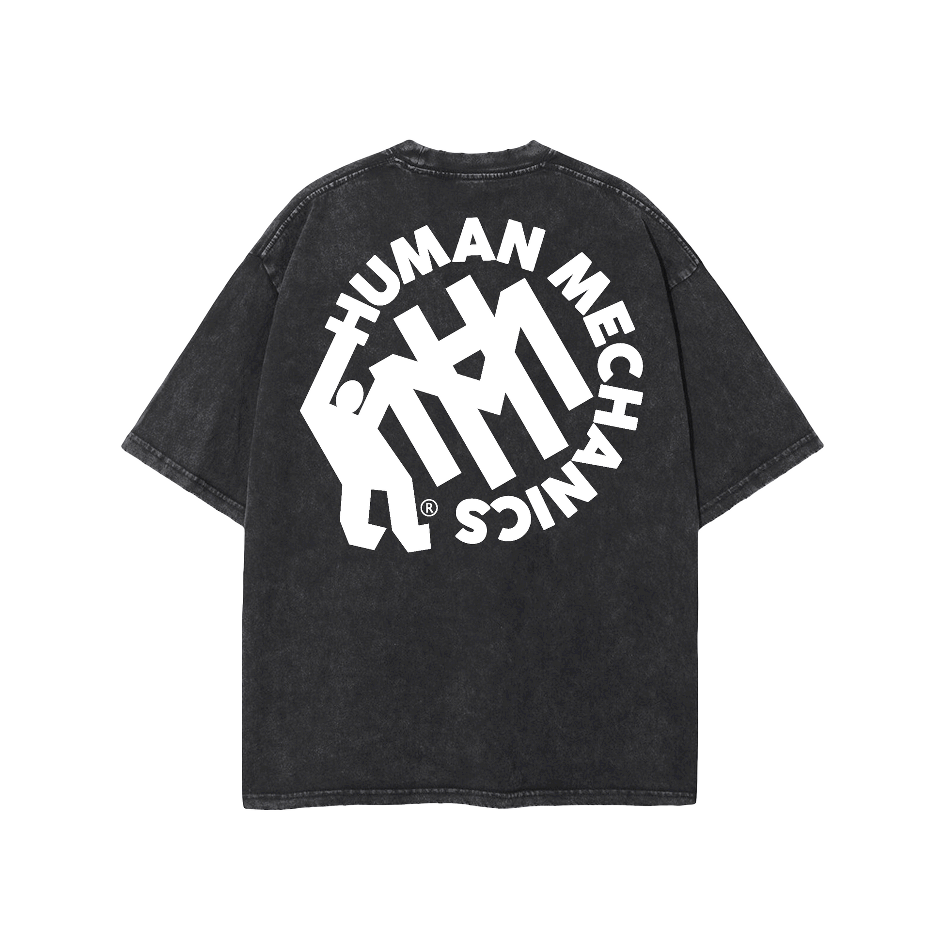 Flip to the back, and the oversized Human Mechanics™ circle logo dominates the design — a statement of identity and power. The crisp white print contrasts against the washed-black fabric, representing balance between grit and clarity.